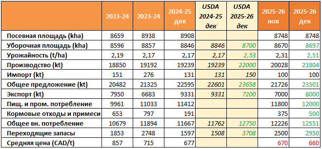 Прогноз экспорта от американских экспертов ниже – 7 200 тыс. тонн, тогда как МСХ Канады повысило прогноз до 8 000 тыс. тонн.